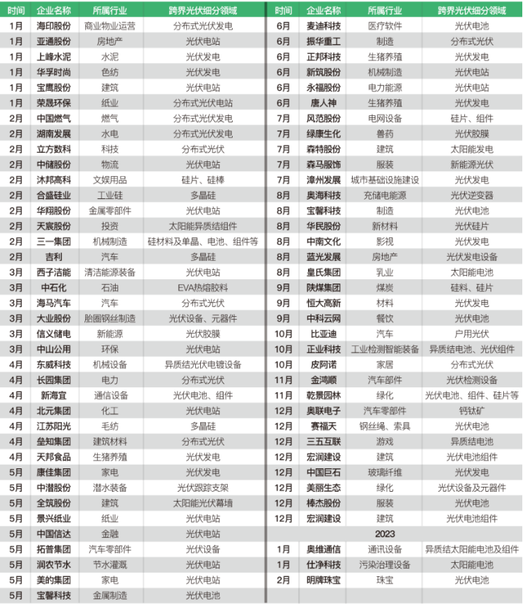 2022-2023年部分跨界光伏上市企业统计