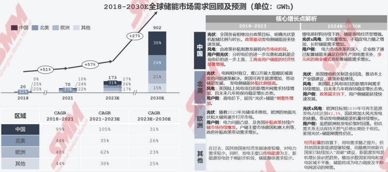SMM对2024年到2030年的中国、北美、欧洲以及其他国家储能行业的发展做出展望,具体如下: